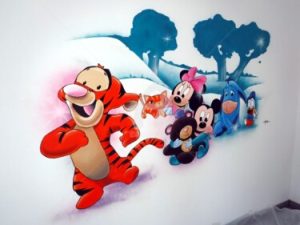 Transformez la chambre en un monde enchanté peuplé des personnages préférés de votre enfant. Peignez des scènes mettant en vedette Mickey Mouse, Minnie, Donald Duck, et leurs amis de Disney, ou optez pour les personnages colorés de Pixar comme Woody et Buzz l’Éclair. Cette idée apporte une touche de magie et de nostalgie à la chambre de votre enfant.